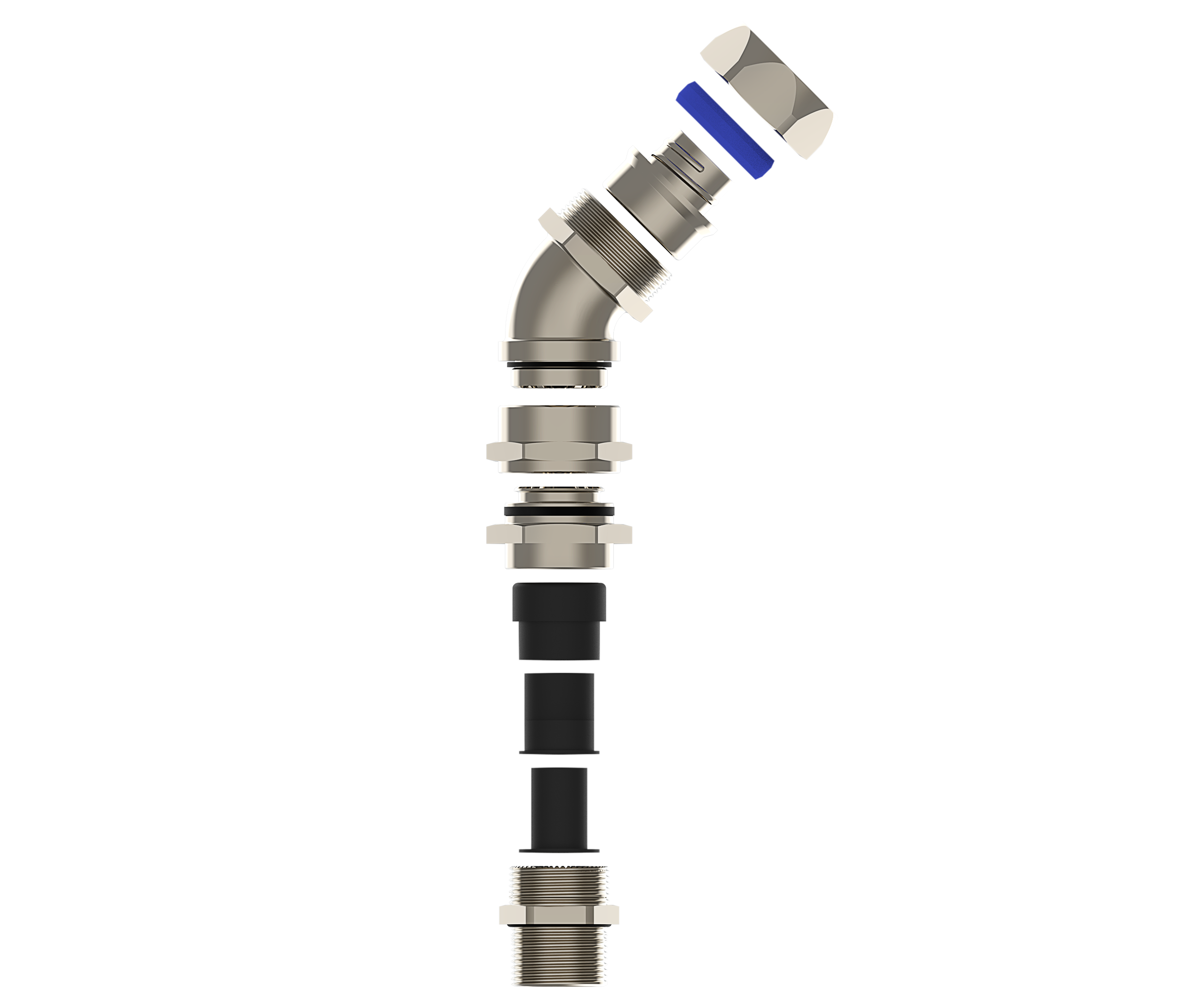 The rear seal provides IP and retention of the flexible conduit, at a 45° angle from the equipment.
