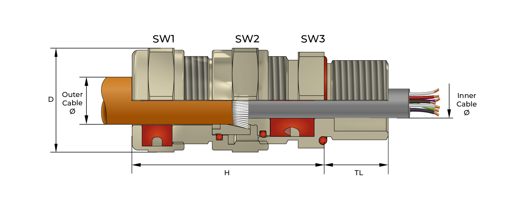 Double compression design provides both a flameproof seal on the inner cable sheath and an IP and cable retention seal on the outer jacket.
