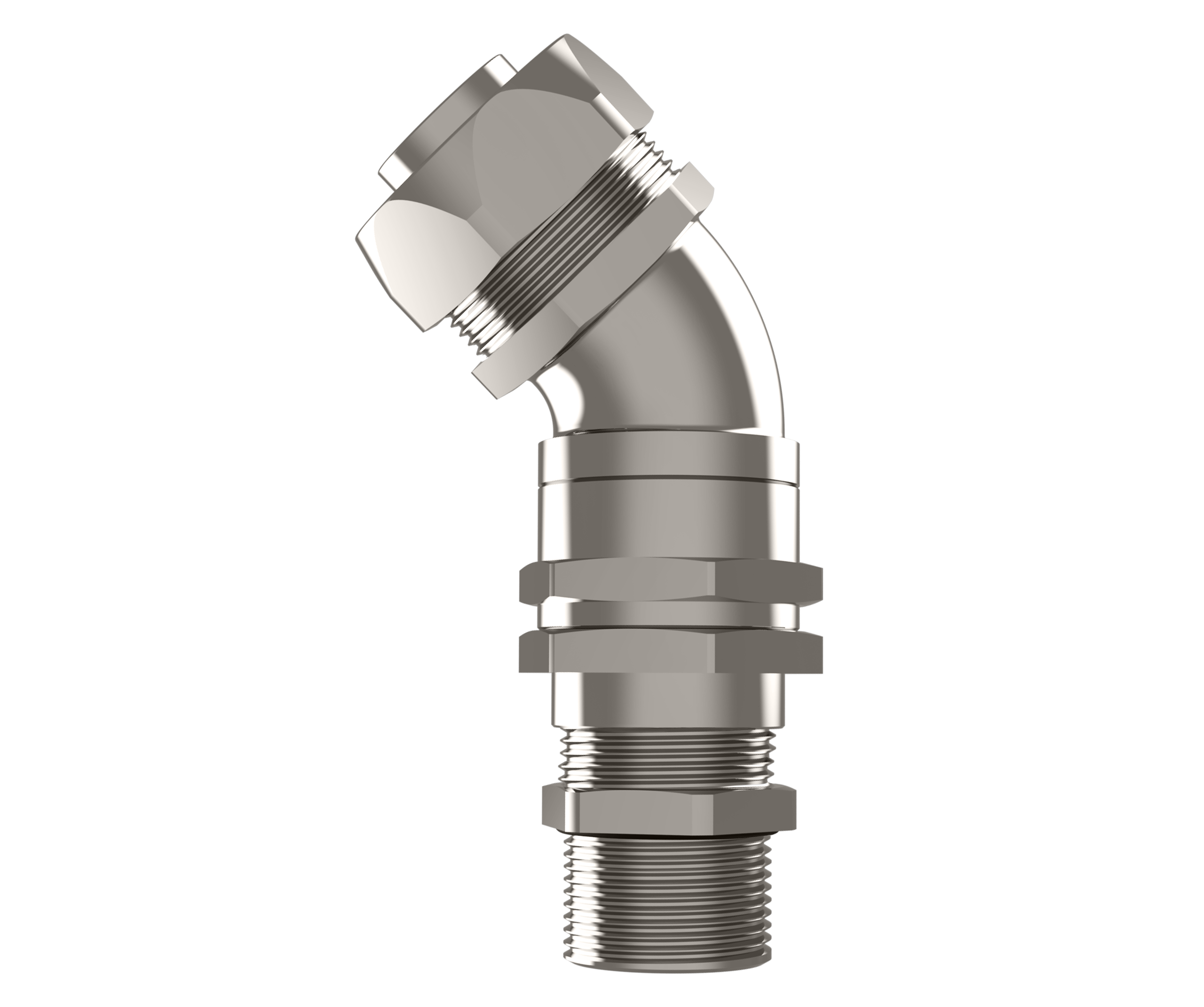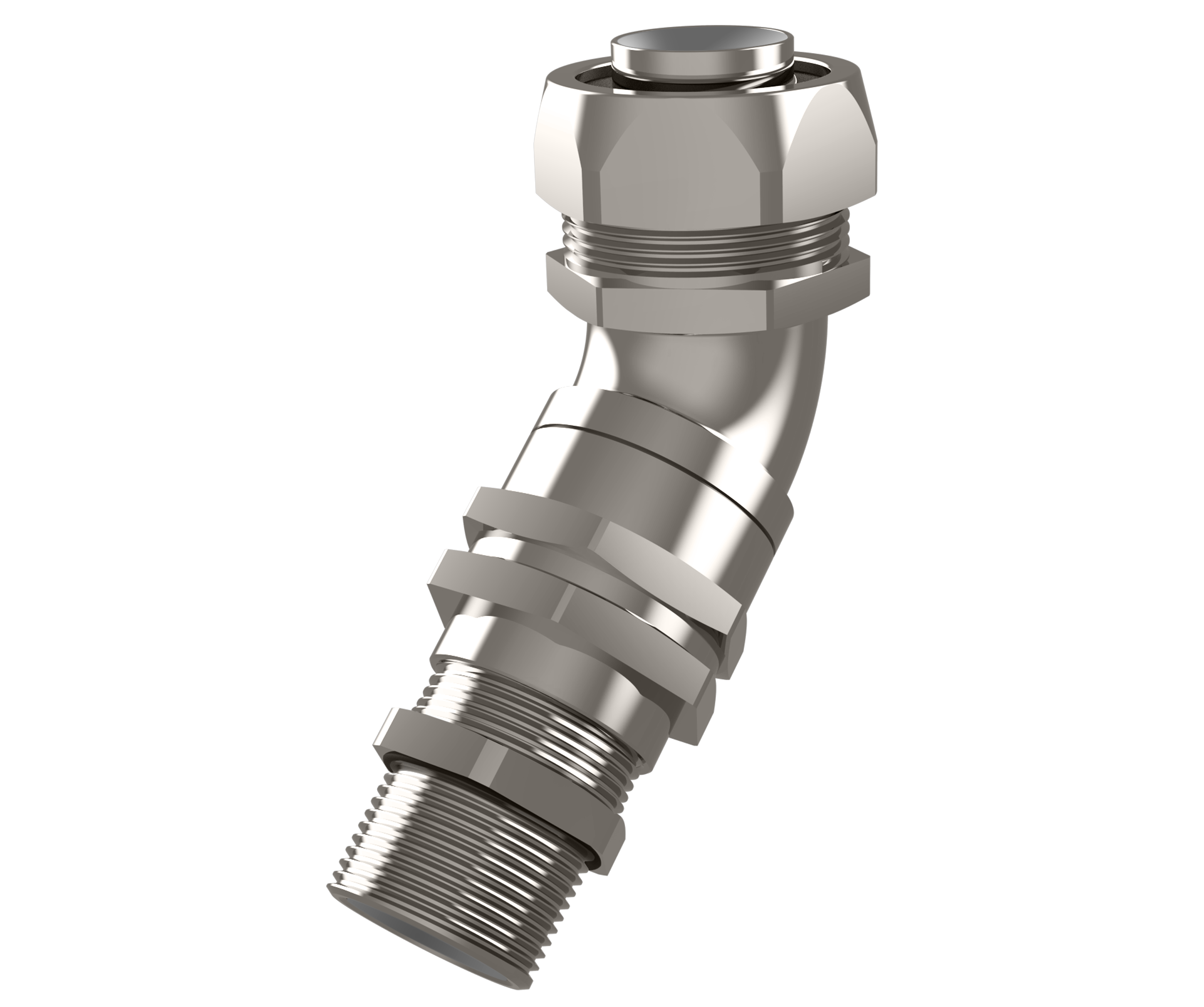 Group II hazardous area 45° conduit fitting, suitable for unarmoured cables in flexible conduit.