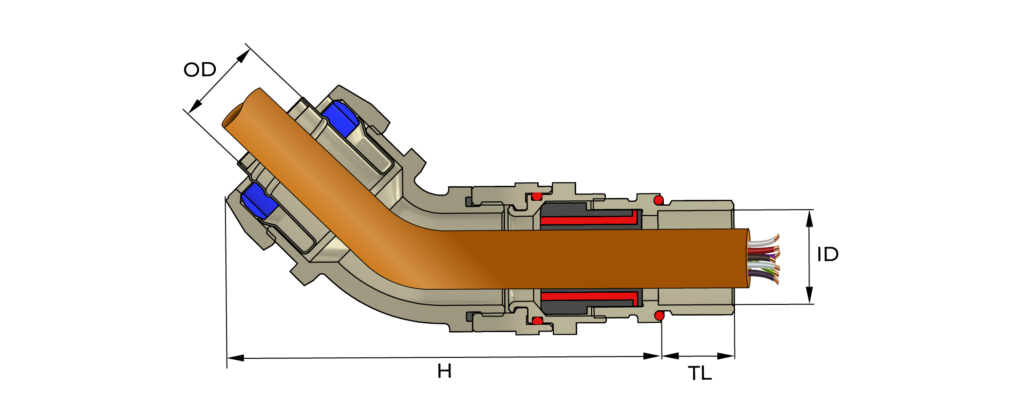 The rear seal provides IP and retention of the flexible conduit, at a 45° angle from the equipment.